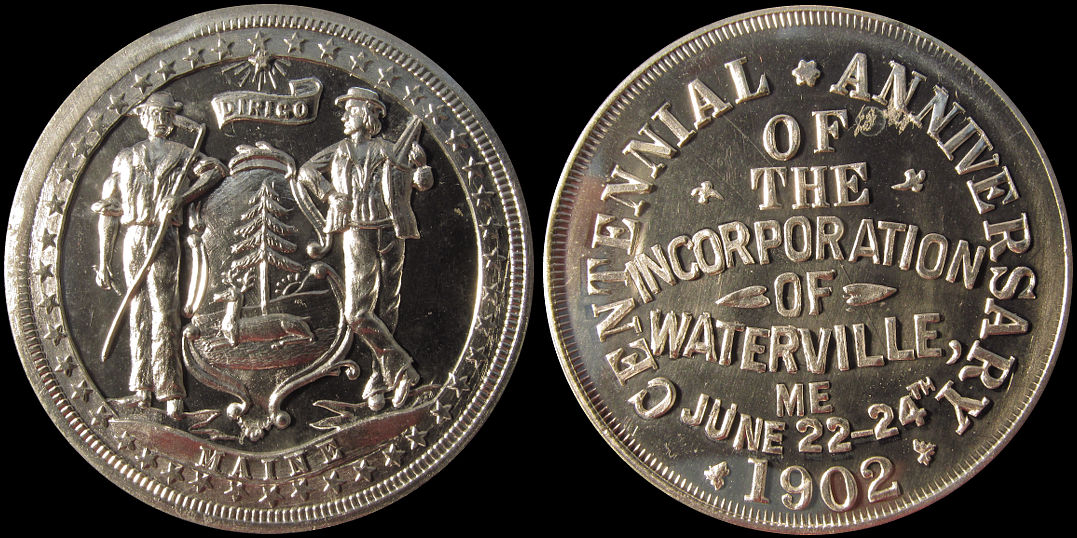 183a) Centennial Anniversary Of The Incorporation Of Waterville Maine June 1902. Look at #178 above for the same obverse die. The reverse of this piece shows poor die workmanship. Notice how "Centennial Anniversary Of The" is in a different font from the rest of the inscription, and also, the last part of the inscription is crowded in, with lettering poorly placed. This is the only one I have seen. Extremely Rare. Aluminum, 37.6mm |