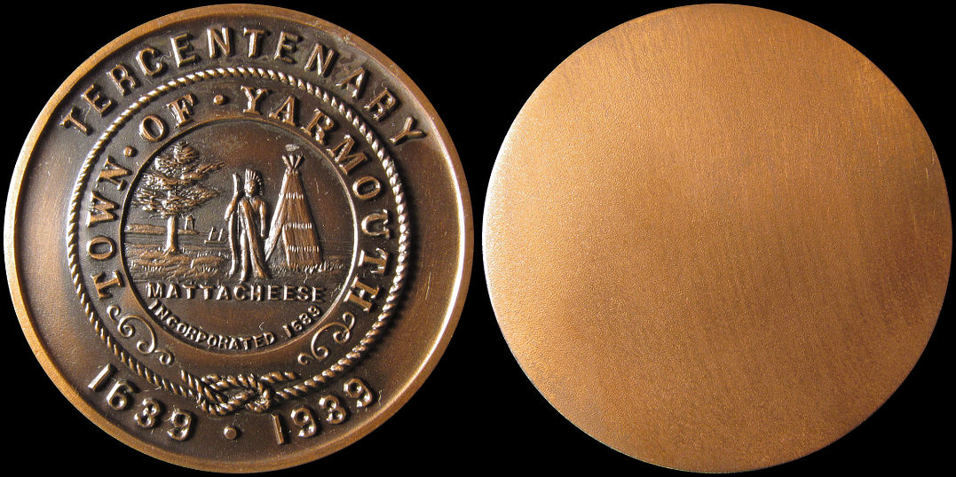 205) Commemorating the 300th year anniversary of the town of Yarmouth, Massachusetts in 1639 1939. This is the only one of these I have found. Blank reverse. Extremely Rare. Antiqued copper, 35mm. |