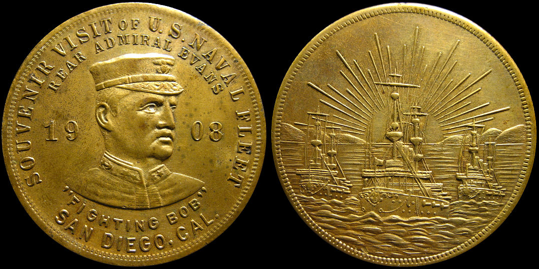 283a) This is a variety of HK351, but with no dots before or after "To Pacific Coast", and with "1908" higher up in the field. I am not sure of the rarity of this piece compared to HK351. From the collection of Bill Walter. Rare? Brass, 36.3mm |