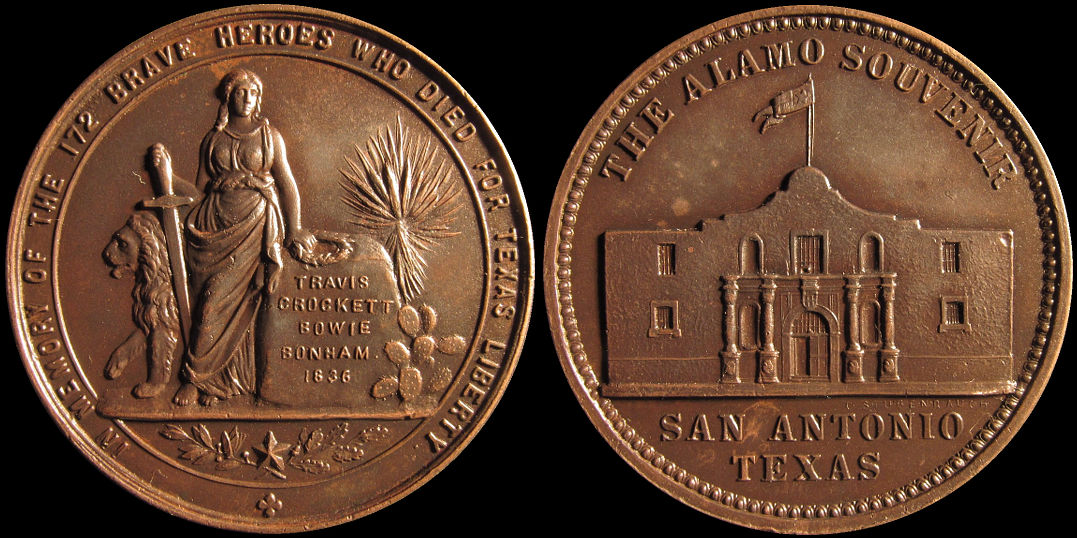 294a) An undated Alamo souvenir medal by Carl Stubenrauch, probably made when he lived in San Antonio in the 1890s. There are similarities to this piece and HK-5. Look at Paul Koppenhaver sale July 30, 1993 lot #131 for another example. "C. Stubenrauch" below Alamo building in tiny lettering that is barely visible in my image. Very Rare. Bronze, 37.1mm |