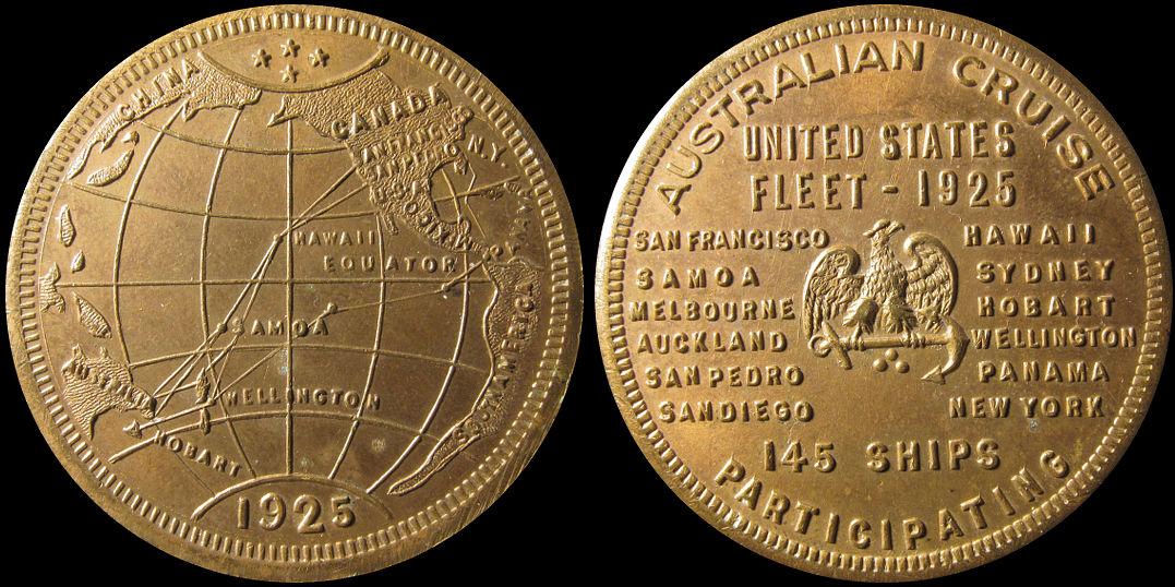 285) A commemorative souvenir of the 1925 Australian Cruise of the US fleet. "San Francisco Samoa Melbourne Auckland San Pedro San Diego Hawaii Sydney Hobart Wellington Panama New York". There are two reverse die varieties of this piece, the most obvious difference being a curved "AUSTRALIA" on one variety and a straight "AUSTRALIA" on the other (IMAGE). Both appear to be of similar rarity. Very Scarce. Brass, 38mm. |