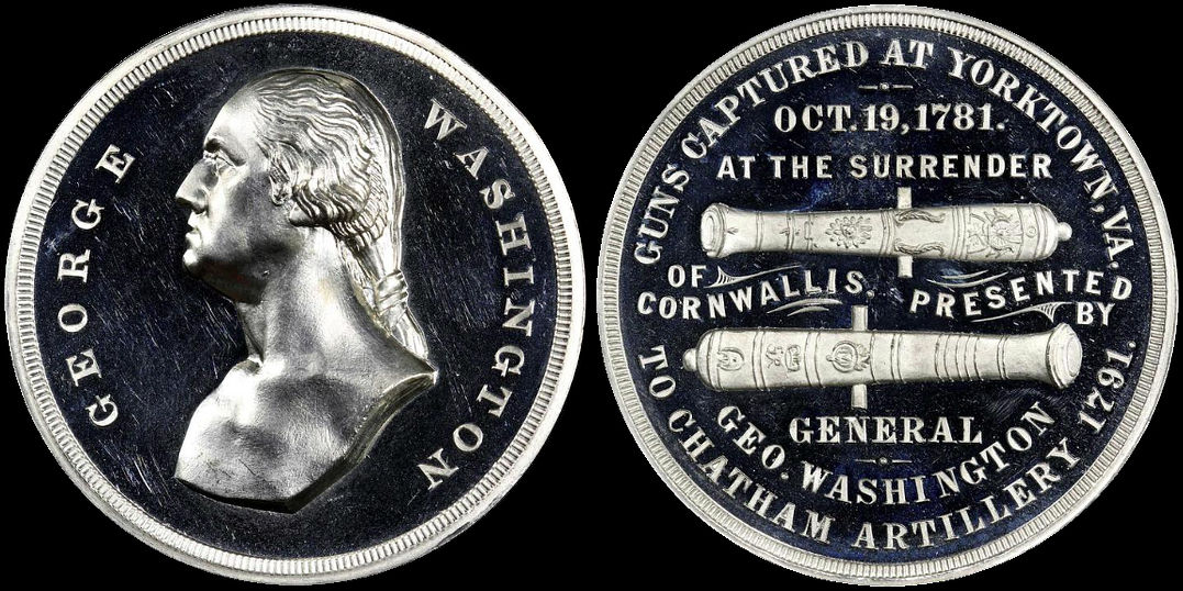 266a) Baker E-452. Commemorating the 1791 presentation of guns to Chatham Artillery by George Washington, captured at the surrender of Cornwallis at the battle of Yorktown ten years earlier. Very rare in bronze and white metal. Also found one example in gilt copper(Kurt Krueger auction #142 lot#2787). Have not located any in silver. Rulau/Fuld only lists in bronze. 44.8mm White Metal. Image Courtesy of Stack’s Bowers Galleries www.stacksbowers.com |