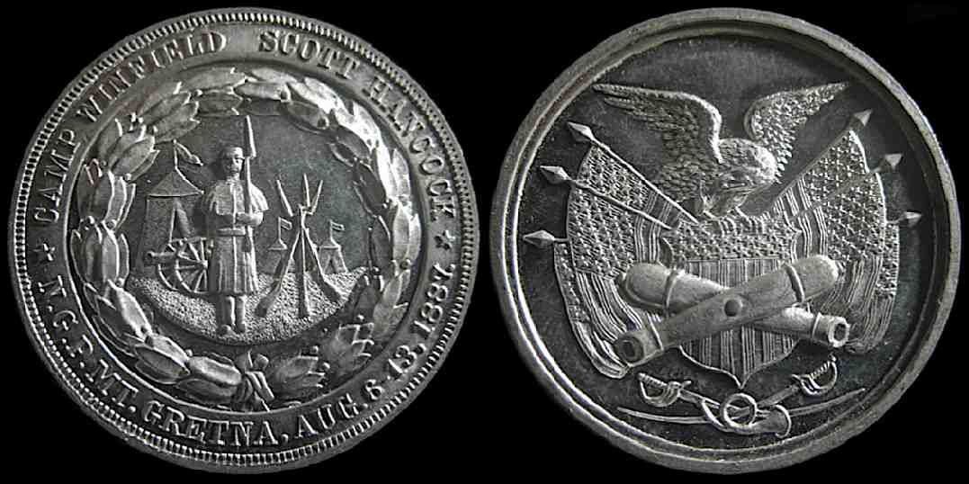 304a) National Guard of Pennsylvania / Camp Winfield Scott Hancock / N.G.P. Mt. Gretna, Aug. 6-13, 1887. A National guard die combined with a GAR die. White Metal, 35.2mm. Click HERE for historical info about the event. |