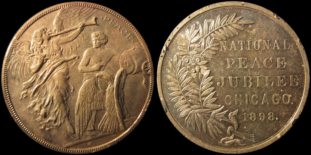 282b) From the National Peace Jubilee held in Chicago October 1898. This piece can be found with two as made rabbit ear loops with an attached "Souvenir" top bar. The piece shown here shows signs of having had a clamped on loop, but shows absolutely no signs of ever having rabbit ear loops, so found both ways. Very Rare, Brass, 38mm. |