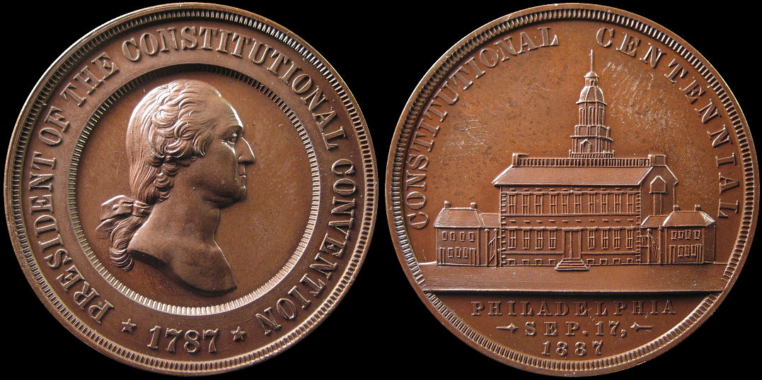 268) Commemorating the centennial of the adoption of the U.S. Constitution. Baker-1800 and Baker-1800A. Very Scarce in white metal, but Very Rare in nicer Unc in white metal. Approx. 60% are holed in white metal and sometimes found with top eagle pin attachment. Rare to Very Rare in bronze, and usually found in nice condition as such and never(?) holed. Bronze, 37.7mm. |