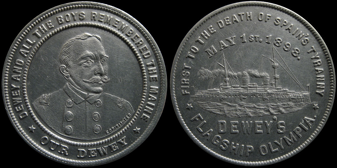 276) Medal of Admiral George Dewey and the Battle of Manila Bay. Small "HR" monogram above Dewey's right shoulder. There is also a second variety of this medal that lacks the "HR" initials, and with a different style of lettering. Both appear to be Rare. The variety without the HR monogram might be an older(original?) variety, and is sometimes found holed. The other possibly newer variety shown here is almost never found with a hole. Aluminum, 37.9mm. Find ADMIRAL GEORGE DEWEY COLLECTIBLES on ebay |