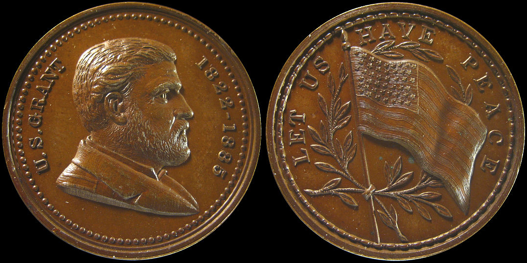 280) "U.S. Grant 1822-1885". Obverse of HK278 with the same reverse as the one above. I bought this one on eBay in 2006 and it is the only one I have found in any metal. Extremely Rare. Bronze, 35.1mm. Look through ULYSSES S. GRANT items on ebay |