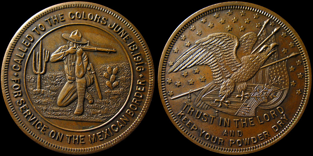 299) "Called To The Colors June 18, 1916 / For Service On The Mexican Border". Has been designated as HK-894C by NGC. I have found this piece described as copper, brass(gilt?) and silvered bronze. All three together, Rare. Bronze, 36mm. Look for MEXICAN BORDER medals on ebay |