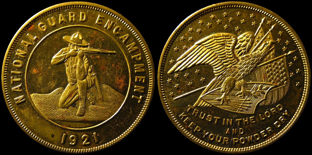 302) "National Guard Encampment". Dated 1921. Has been designated as HK-894H by NGC. Read #301 above. Very Rare. Brass, 36mm. |