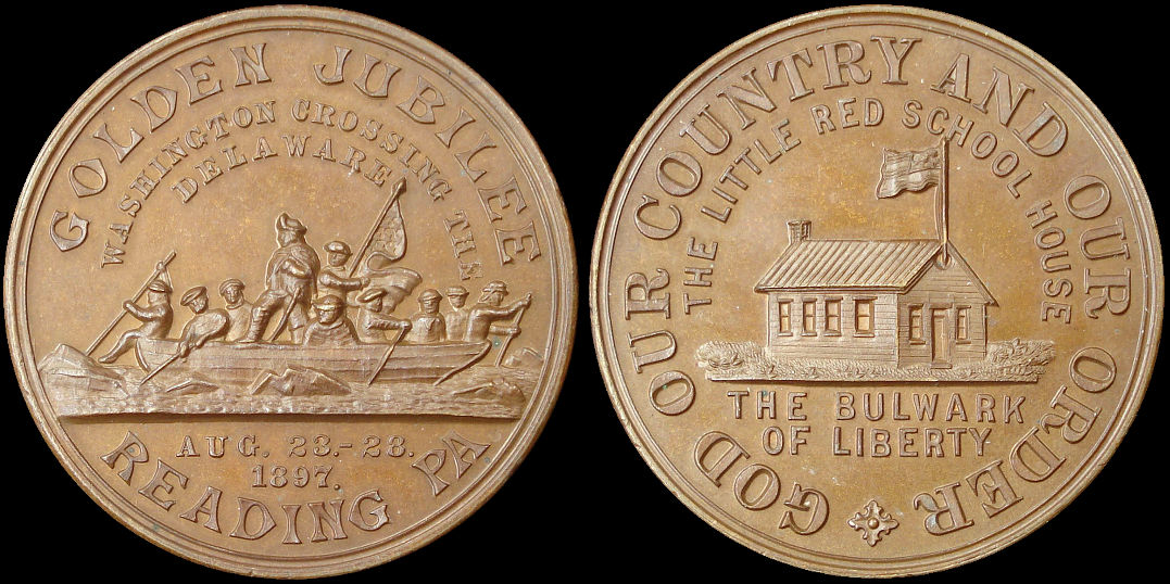 275e) Commemorating an 1897 Reading Pennsylvania Golden Jubilee, showing Washington crossing the Delaware. Rare in Bronze and Rare in White Metal. Comes holed at least half the time in either metal. I found one in white metal described as having a "Patriotic Order Sons Of America" pin and R/W/B ribbon. This reverse is also found combined with the reverse of #264 above. 37.8mm. Image courtesy Jonathan Brecher. |