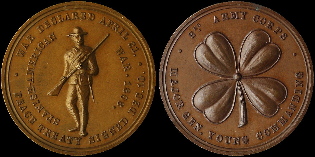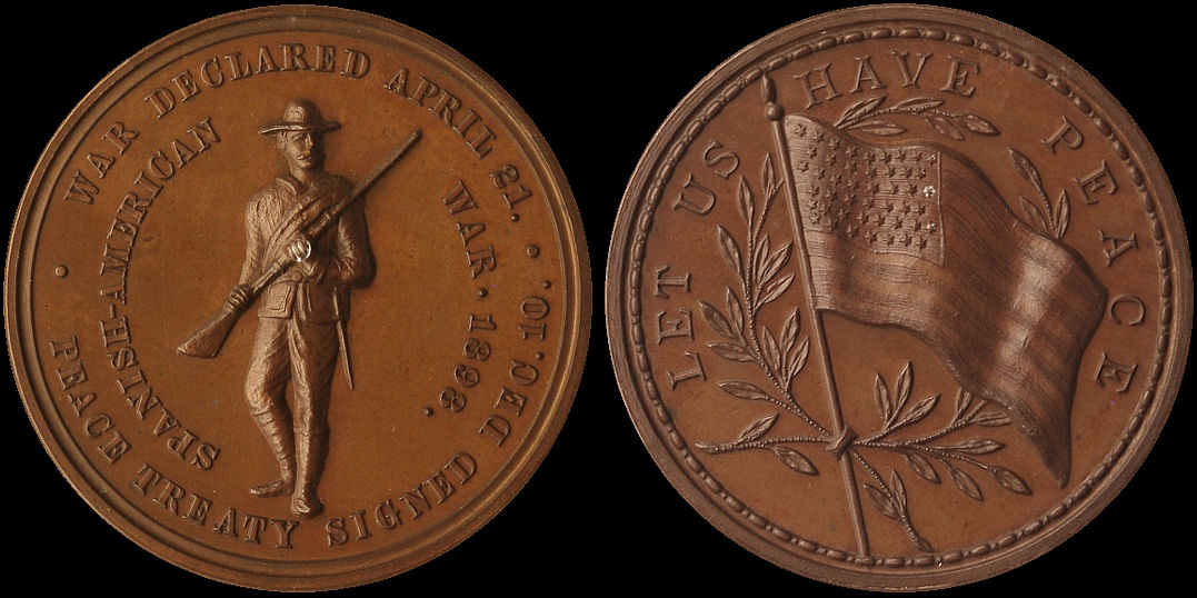 281) End of the Spanish American war. Same "Let Us Have Peace" reverse as the two above medals. Found holed in white metal with hanger, and un-holed in bronze. Very to Extremely Rare in either metal. Bronze, 35mm. Image courtesy Randy Dobler. |
