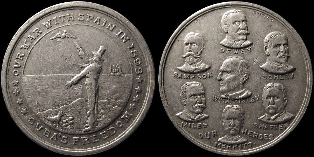 278) "Our War With Spain In 1898/Cuba's Freedom". Looking through old auction/sales catalogs I found only one(Presidential Coin and Antique Co. #49 lot#718). The one shown here was off ebay. Very Rare. Aluminum, 38.5mm. Find CUBA and the SPANISH AMERICAN WAR items on ebay |