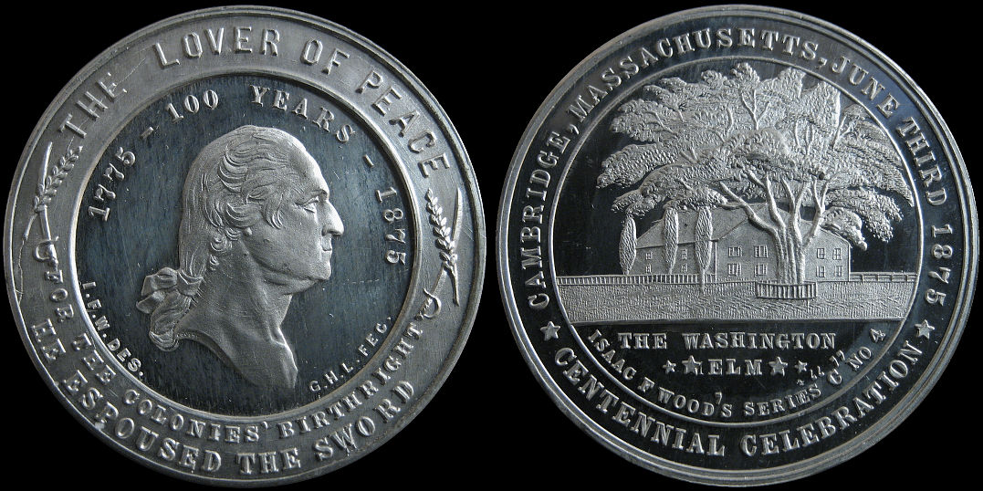 275b) Washington Elm medal by George Lovett. "The Lover Of Peace". Baker 436. Found in copper/bronze and white metal. Combining both metals together, Very Scarce. Rare in either metal. White Metal. 39.7mm |