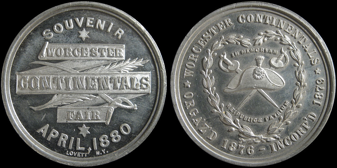 274a) From an 1880 Grand Benefit Fair for the Worcester Continentals. This was no doubt a public benefit fair for the organization. The Worcester Continentals were a Massachusetts military fraternity. By George Lovett. Found in bronze and white metal. Rare in either metal and sometimes holed in white metal. 39.8mm |