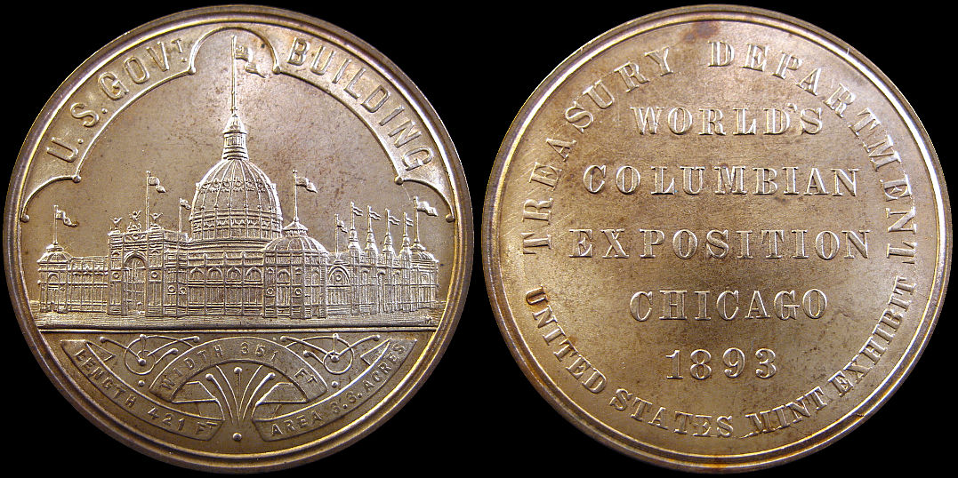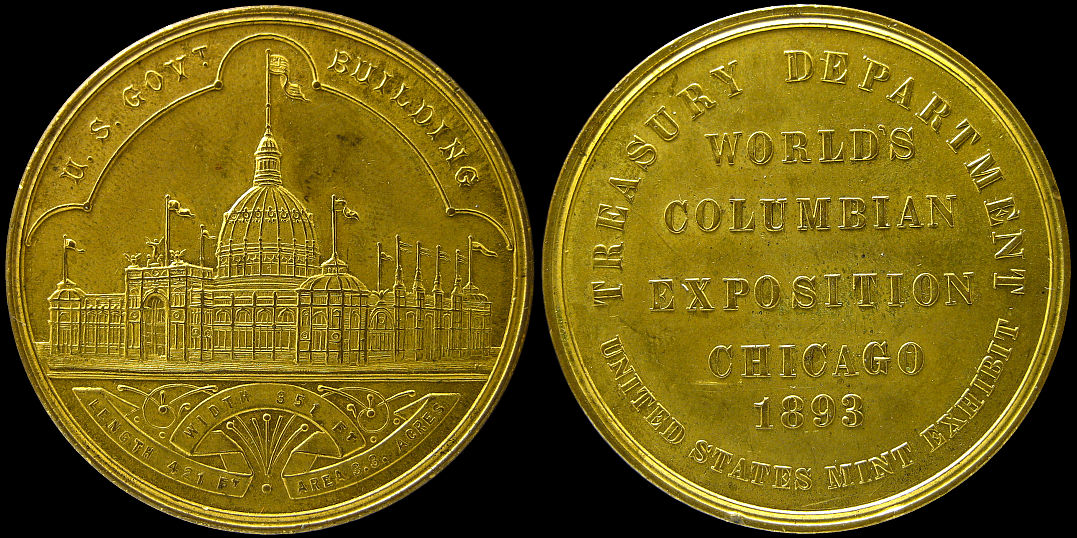 1) Building with central dome and flags. U.S. Govt. Building above in LARGE letters. Width 351 ft below in center arc. Length 421 ft Area 3.3 Acres at lower left and right. Rv: Treasury Department around above. United States Mint Exhibit around below. World's Columbian Exposition Chicago 1893 in five lines. /// Common in Brass(some look Gilt), very scarce in Silver Plate, extremely rare in Silver and Aluminum / 37.7 mm / SH6-1, HK154, Eglit23 (IMAGE)