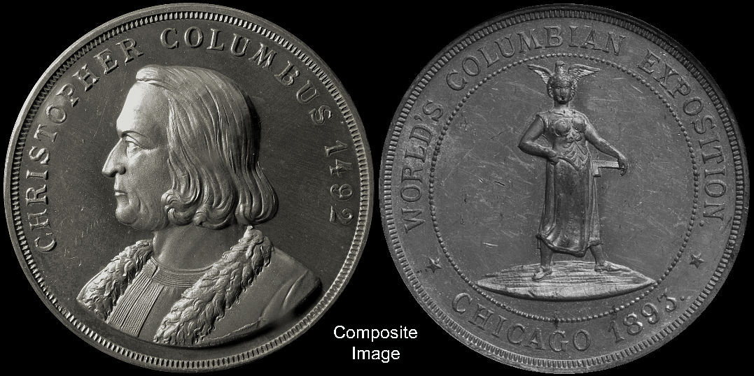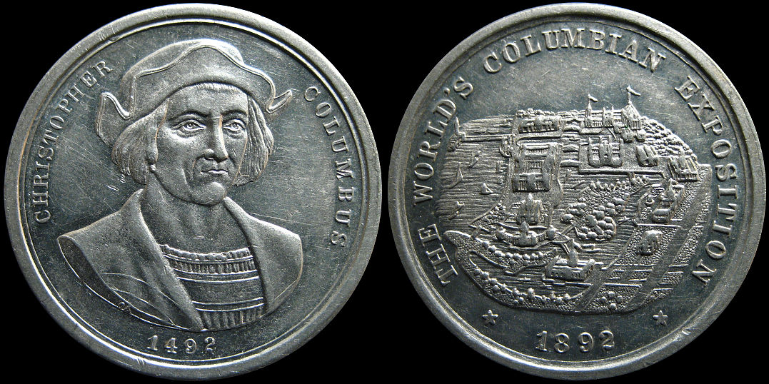 154) Bust right. Christopher Columbus around to the left and right. O.L.W. under chin, Rv: Three ships. To Commemorate the Dedication of the World's Columbian Exposition at Chicago On The Four Hundredth Anniversary Of The Discovery Of America By Christopher Columbus October 21 1892 above and below ships in eleven lines. /// Found in multiple metals: silver, white metal, bronze, nickel, aluminum, lead, and silver plate, with lead and nickel perhaps being the rarest, and the most common possibly being bronze, with the majority in bronze being looped and often with attached ribbon hanger. The American Numismatic Society in New York has a number of these on their web site in various metals with pictures. / 34.9 mm / SH6-158, Eglit334 and Eglit406 with picture. (IMAGE without any evidence of a loop)