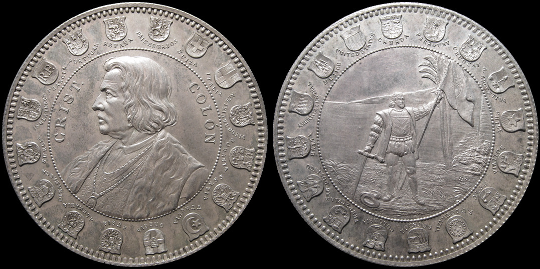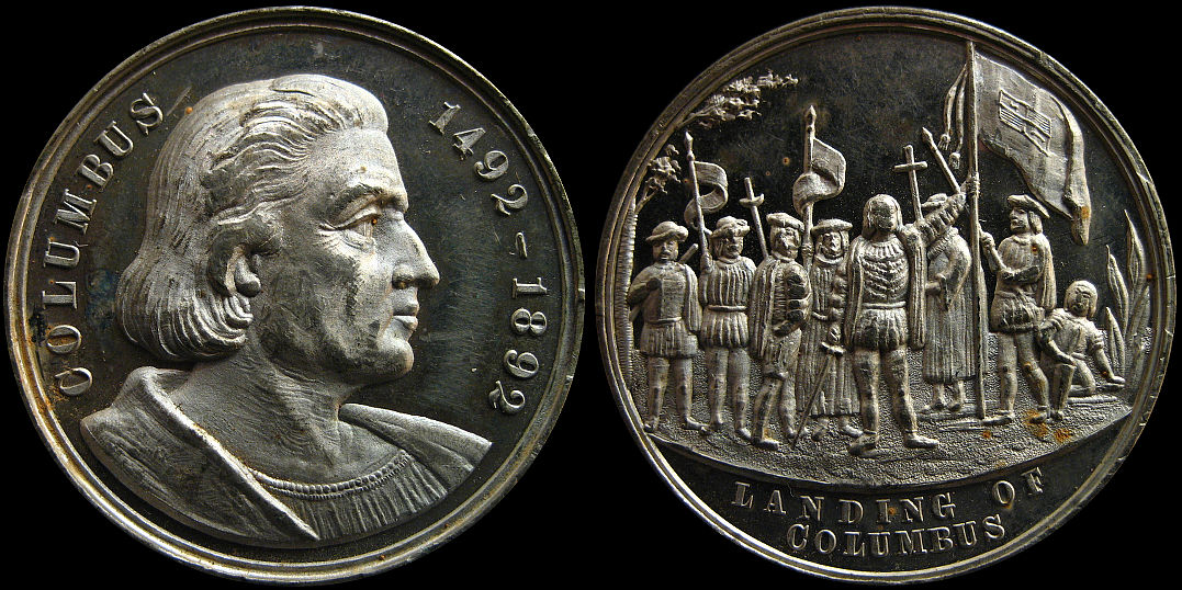 125) Bearded and laureated bust left. Christopher Columbus around to the left and right. 1492 below. Rv: Landing scene with four figures within inner circle. 400th Anniversary Of The Discovery Of America around above. Oct 12 1892 below. /// Very scarce, White Metal / 37.7 mm / SH6-108, HK236, Eglit432 (IMAGE)
