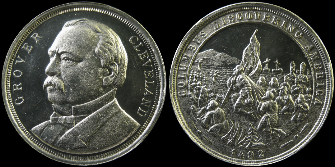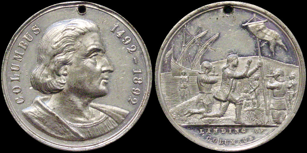 94) Liberty head left in low relief. Stars around in outer circle. Beaded outer border next to rim. 1892 below. Small W.M. below bust. Rv: Columbus landing scene with multiple figures. Dedicated To The American People In Honor Of The 400th Anniversary Of The Discovery Of America around above. United We Stand Divided We Fall below. 1492 inside inner circle below. /// Rare in Aluminum. Unlike the high relief version, the low relief version is quite hard to find in anything but aluminum. My linked image here is an example in brass. Besides the bronze low relief entry in HK, it may also exist in gilt, silver, and silver plate. / 35.8 mm / SH6-80, HK220a, HK222a (IMAGE)