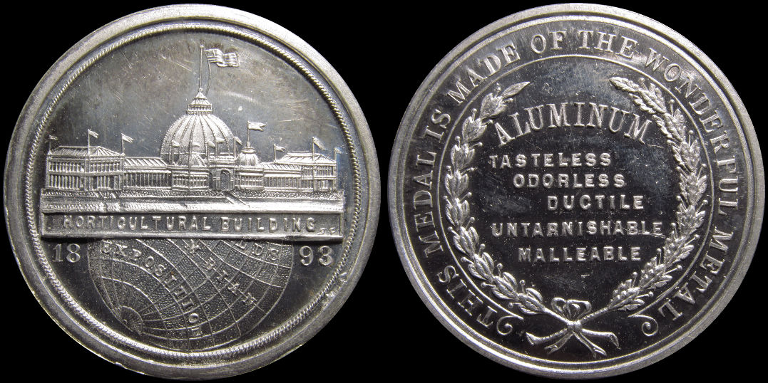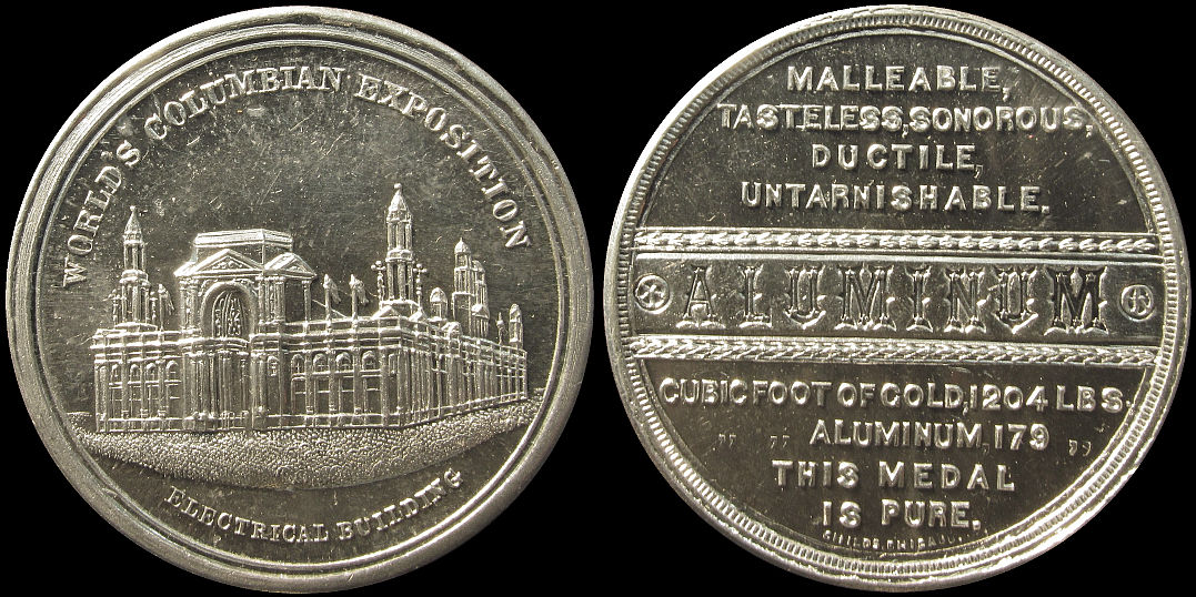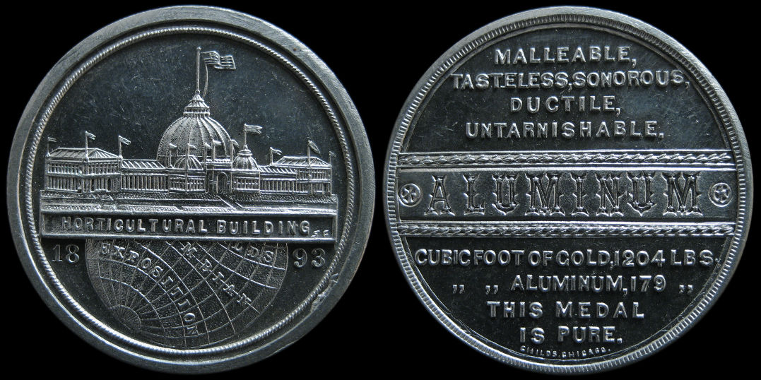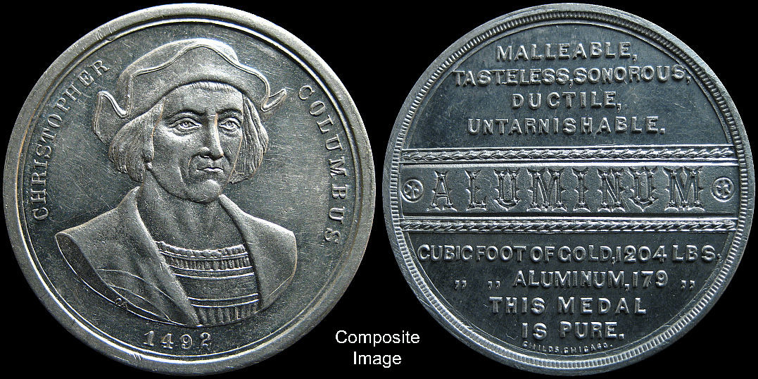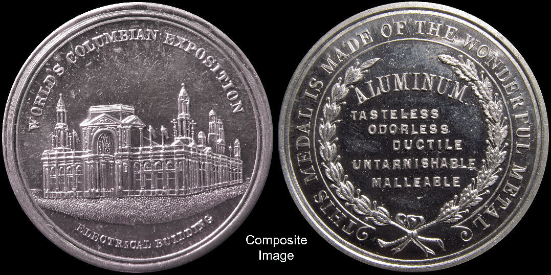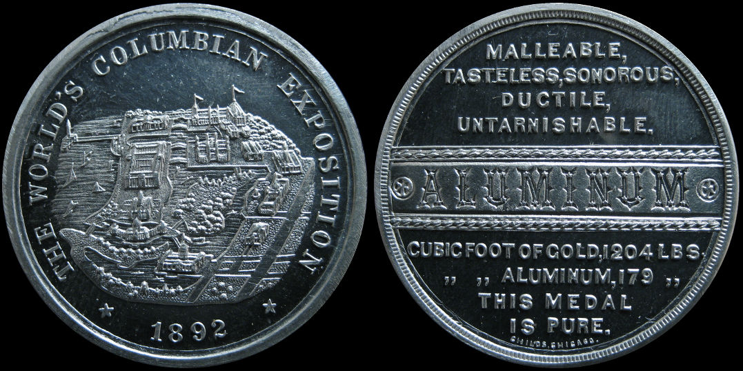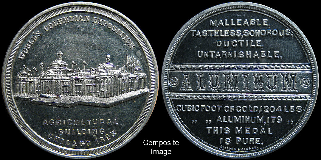 9) Aerial view of fair. The World's Columbian Exposition around above. 1892 below. Rv: Incused ALUMINUM across the middle between two lines. Malleable Tasteless Sonorous Ductile Untarnishable. above in four lines. Cubic Foot Of Gold, 1204 lbs Aluminum 179 This Medal Is Pure below in four lines. Childs, Chicago. around below next to rim in tiny lettering /// Rare, Aluminum / 37.0 mm / SH6-50, HK161, Eglit443 (IMAGE)