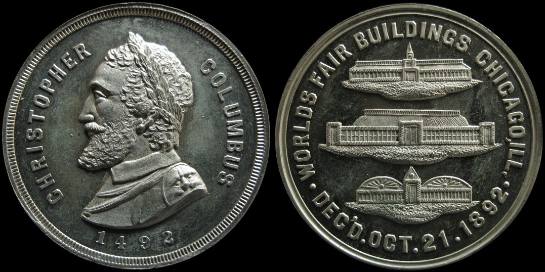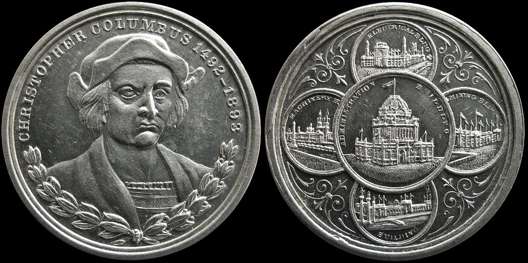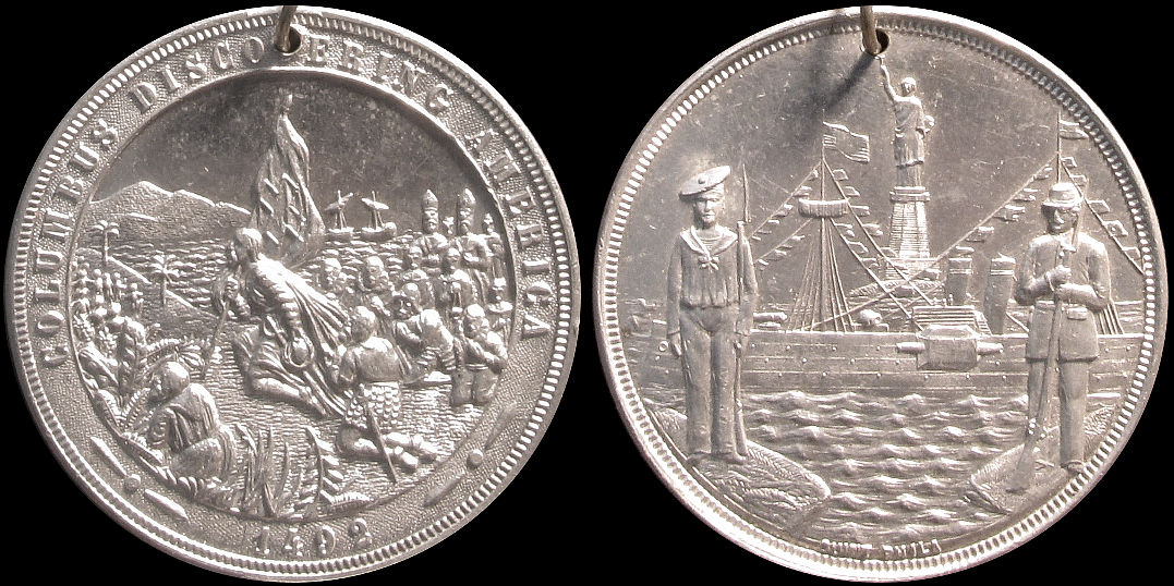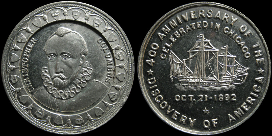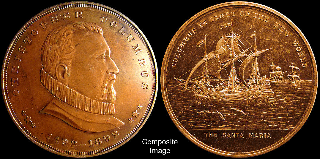 188) Bearded bust left within inner circle. Closed wreath-like border around outside inner circle. Christopher Columbus around to the left and right of bust within inner circle. 1492 1892 to the left and right above shoulders within inner circle. Rv: Sailing ship. Quadri-Centennial Of Discovery Of America Celebrated At Bridgeport, Conn. around above in two arcs. October 21.1892 around below. The Santa Maria below ship. /// Very scarce to rare in Copper Plated Bronze. Rare in White Metal. Have also found described as Silver Plate, Silver, and Auminum, each probably extremely rare. / 38.2 mm (measured) / HK624, HK624a Eglit271 (IMAGE)