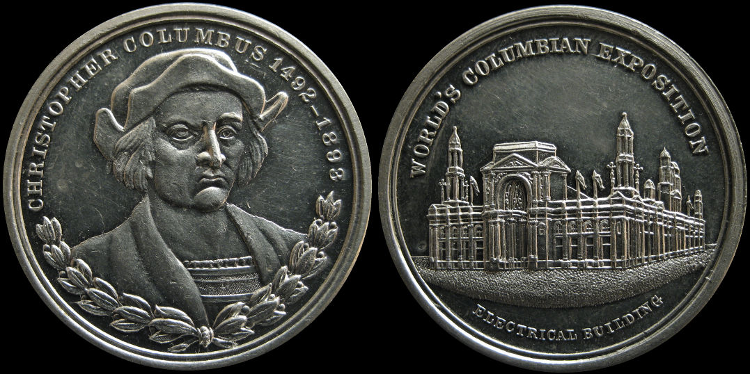 128) Male bust slightly right with hat. Half wreath below. Christopher Columbus 1492-1893 around above. Rv: Building with large front entrance and spires at the corners. Worlds Columbian Exposition around above. Electrical Building below in a curve. /// Very rare, Aluminum / 37.1 mm (measured) / SH6-124. The obverses of HK236a and HK159a. Reverse as the obverse of HK161a in the second edition of HK (IMAGE)