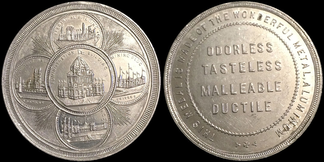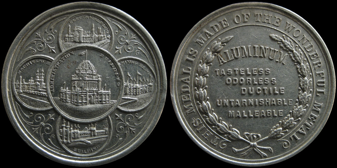 130) Five buildings within five circles. Ornamental scrolls between four outer circles. Administration Building in the larger center circle. Machinery Hall in outer left circle with the last part of HALL covered up. Electrical Bldg in upper circle. Mining Bldg in right circle. Building inside of bottom of lower circle.Rv: Open Wreath. This Medal Is Made Of The Wonderful Metal around outside. Aluminum Tasteless Odorless Ductile Untarnishable Malleable in six lines within wreath. /// SH6-54. Very to extremely rare, Aluminum / 37.1 mm / Obverse of HK162a or reverse of HK236a combined with the reverse of HK159a. The reverse of HK159 and Hk159a are similar but with a different order to the words describing aluminum. (IMAGE)