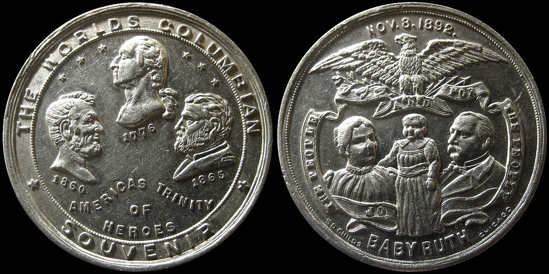140) Two busts on either side of baby Ruth. Eagle above. Nov. 8, 1892. above. Of The People And For The People on streamers. Baby Ruth below. S.D. Childs Chicago in tiny lettering next to rim split to the left and right. Rv: Three small busts. The Worlds Columbian around above. Souvenir below. Americas Trinity of Heroes below. 1776, 1860 and 1865 below the three busts. /// Scarce, White metal / 38.2 mm / SH6-25, HK241, Eglit80, Eglit80a (IMAGE)