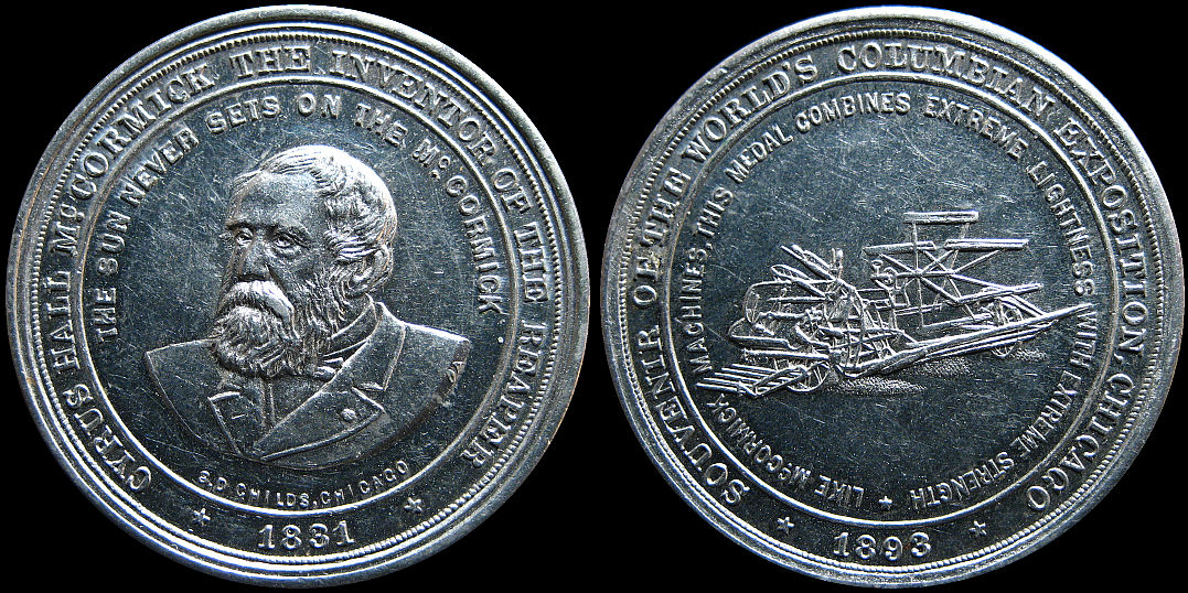 142) Reaper within center circle. Like McCormick Machines, This Medal Combines Extreme Lightness With Extreme Strength around inside circle. Souvenir Of The World's Columbian Exposition, Chicago around outside. 1893 below. Rv: Bust partially left. Cyrus Hall McCormick The Inventor Of The Reaper around outside. The Sun Never Sets On The McCormick around inside. 1831 below. S.D. Childs, Chicago below bust. /// Scarce, Aluminum / 37.2 mm / SH6-11, HK243, Eglit44(Eglit does not distinguish between HK242 and HK243. Look at #141 above) (IMAGE)