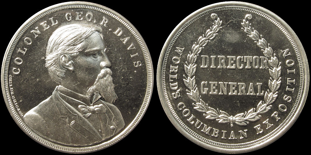 145) Bearded bust right with bow tie. Colonel Geo. R. Davis around above. Childs Chicago in tiny lettering to the lower left next to rim. Rv: Open wreath. Director General within wreath. World's Columbian Exposition around below. /// Rare, Aluminum. Eglit says this exists in Silver, but I have never run across one. / 38.2 mm (measured) / SH6-3, HK243b, Eglit53 (IMAGE)146) Two small busts. Souvenir Medal around above. World's Columbian Exposition Chicago around below. 1492 1898 above within inner circle. Columbus and C.W.G. Ferris above busts. The Ferris Wheel Dimensions in four curved lines. Height 264 Feet Weight 4300 Tons Capacity 2160 Persons Engines 2000 Horse Power below within inner circle. Rv: Ferris wheel within inner circle. Ferris Wheel around above. Greatest Mechanical Achievement Of The Age around below. /// Scarce / Aluminum / 38.1 mm / SH6-12, Eglit20. Neither side of this piece is pictured anywhere in HK. (IMAGE)