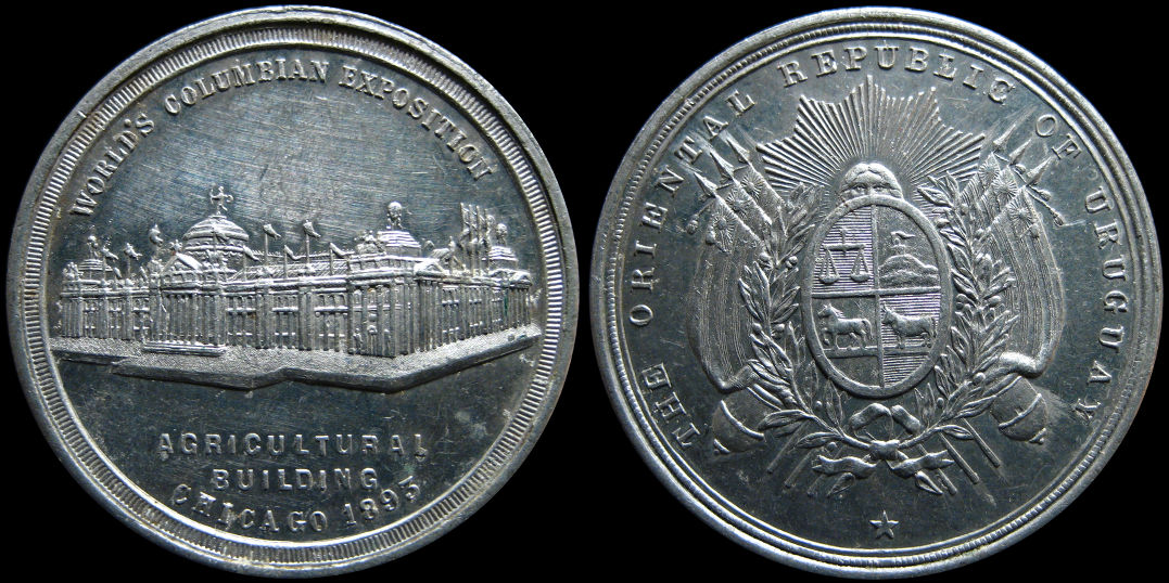 149) Building. World's Columbian Exposition above in an arc. Agricultural Building Chicago 1893 below in three lines. Rv: Coat of arms. The Oriental Republic Of Uruguay around. July 18, 1893. with star star between JULY and 18. /// Included with the variety above, Rare to Very rare. I do not know which variety is rarer, Aluminum / 37.2 mm / Varieties with or without date - look above. SH6-77.1 (IMAGE)