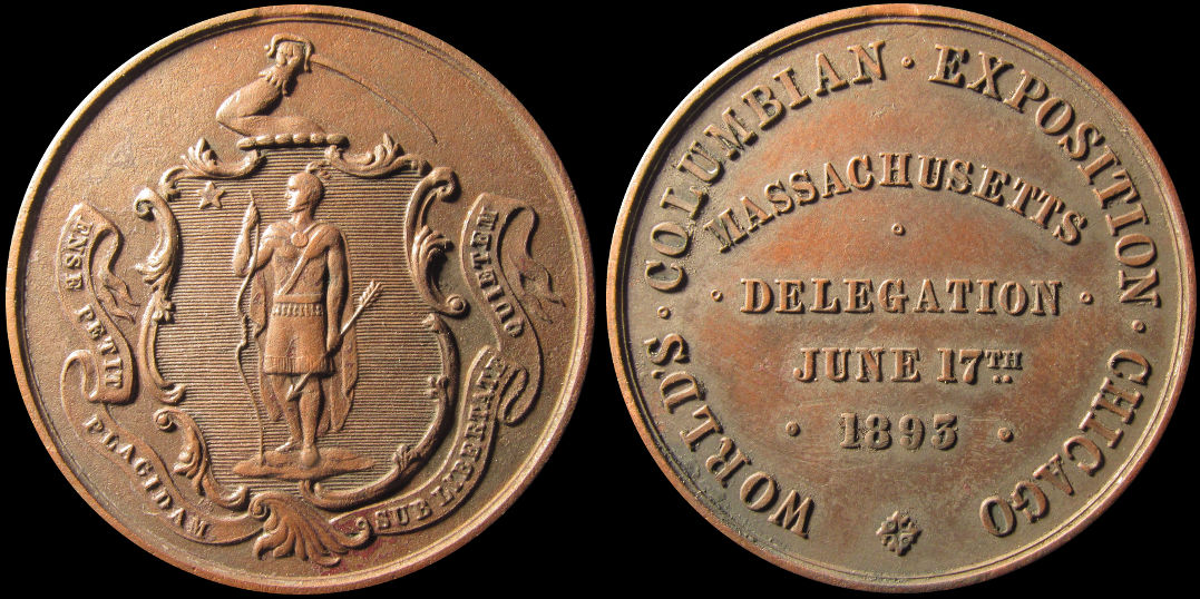 151) Arms of Massachusetts with standing Indian in center. Ense Petit Placidam Sublibertate Quietem on scroll around to the left and right. Rv: Massachusetts Delegation around above. To World's Columbian Exposition Chicago 1892 in five straight lines. /// Rare, maybe very rare, Bronze / 41 mm / SH6-62, Eglit590. Charles Kirtley sale #80 lot#1135