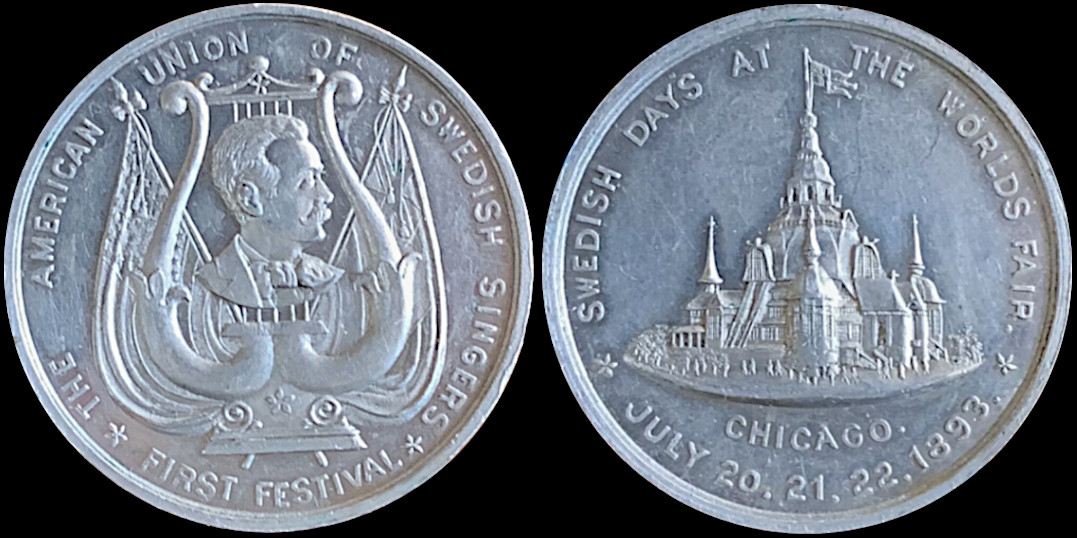 152) Bust right inside of lyre and between flags. The American Union Of Swedish Singers around and above. First Festival below. Rv: Building with tall central spire. Swedish Days at the Worlds Fair around above. Chicago July 20. 21. 22, 1893. below in two curved lines /// Rare, Aluminum / 40 mm / SH6-171, Rulau Chi 157. (IMAGE courtesy Josef Traktovenko)