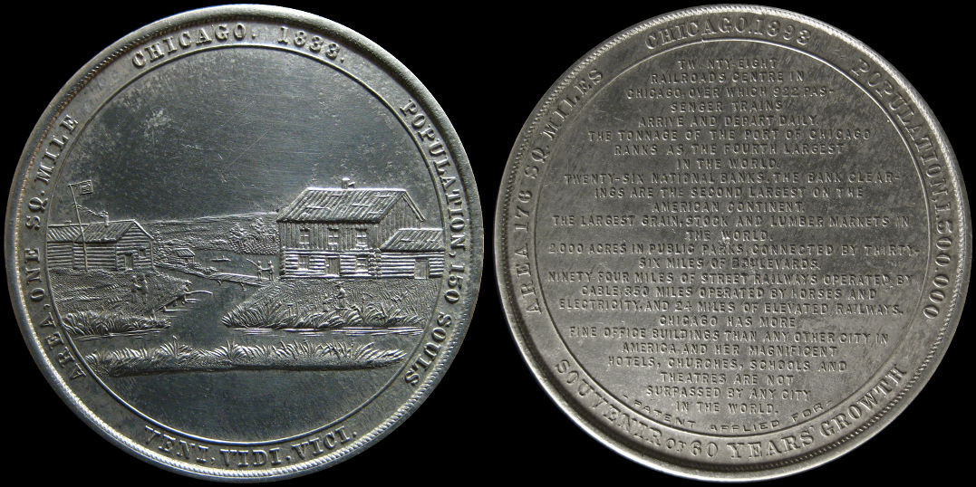 158) Pioneer scene with log cabins all within inner circle. Chicago. 1833. above. Area One Sq. Mile to the left. Population, 150 Souls to the right. Veni, Vidi, Vici below. Rv: Twenty Five line description of Chicago facts within inner circle. Chicago 1893 above. Area 176 Square Miles to the left. Population, 1500000 to the right. Souvenir Of 60 Years Growth below. Patent Applied For. in tiny lettering around bottom of inner circle. /// Very scarce, maybe rare, Aluminum / 44.5 mm / SH6-165, Eglit42, Eglit42A. Varieties with and without PATENT APPLIED FOR.(IMAGE)