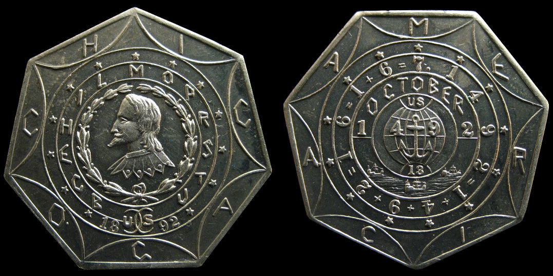163) Small bearded bust left within wreath surrounded by concentric circles. Outside border made of seven arcs each containing one letter and spelling CHICAGO. US and 1892 below bust and wreath. BCEHILMOPRSTU around within second circle. Thirteen stars within third circle. Rx: Small globe and anchor surrounded by concentric circles. Outside border made of seven arcs each containing one letter and spelling AMERICA. 1492 to the left and right and across globe. US above globe. 13 and three tiny ships below globe. 1492=1+4+9+2=16=1+6=7. within second circle. Thirteen stars within third circle. /// Extremely rare, Aluminum / 36.3 mm (Seven sided) / SH6-167, Eglit322 (IMAGE)