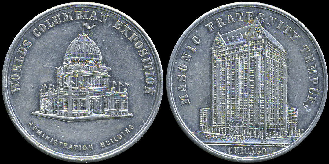 168) Corner view of building with central dome. Worlds Columbian Exposition around above. Administration Building around below. Rv: Multi-story building. Masonic Fraternity Temple around above. Chicago below. /// Very rare, Copper / 38 mm / Obverse the same as HK210a in the second edition of HK. Charles Kirtley October 14, 1989 lot#159m with picture. (IMAGE)