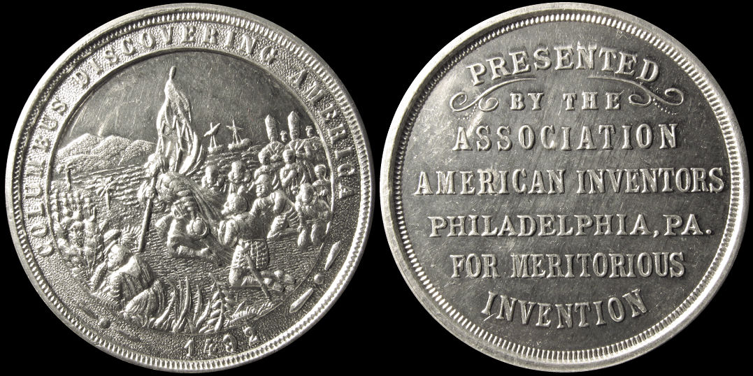 171) Landing scene within inner circle. Columbus Discovering America around above outside. 1492 below Rv: Presented By The Association American Inventors Philadelphia, Pa. For Meritorious Invention in seven lines. /// Rare to Very Rare, Aluminum, 38.2mm (IMAGE)
