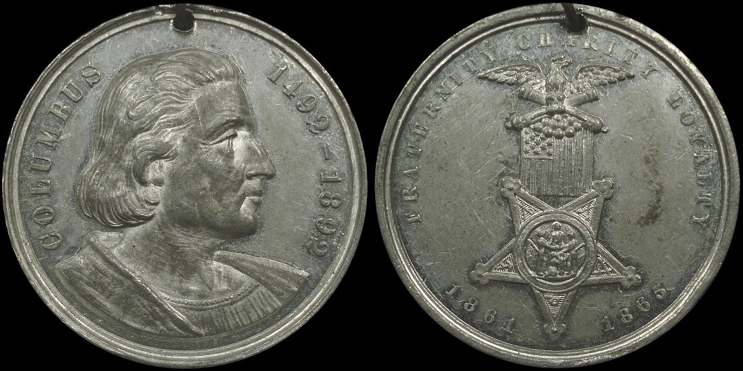 179) Beardless profile of Columbus right. Columbus at left. 1492-1892 to the right. Rv: GAR badge center. Fraternity Charity Loyalty 1861-1865 around /// Most often holed. Very rare, White Metal / 38 mm / Eglit56 (IMAGE courtesy Jonathan Brecher)
