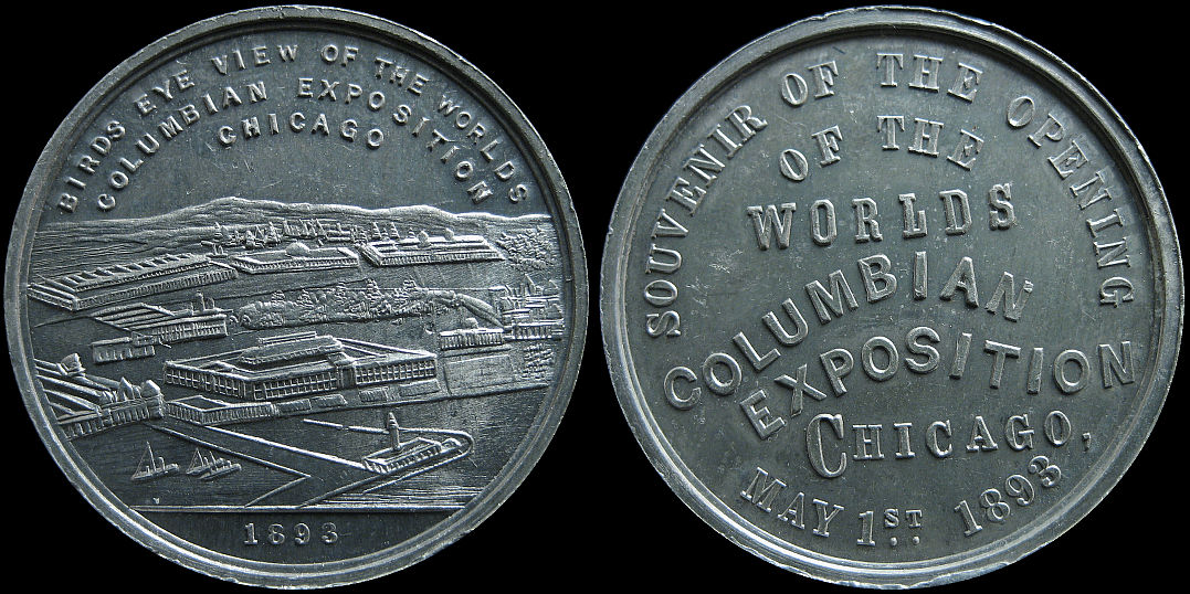 18) View of the exposition. Birdseye View Of The Worlds Columbian Exposition Chicago in three curved lines above. Rv: Souvenir Of The Opening Of The Worlds Columbian Exposition Chicago, May 1st 1893 in seven curved and straight lines. /// Rare, Aluminum / 34.7 mm / SH6-6, HK164, Eglit547 (IMAGE)