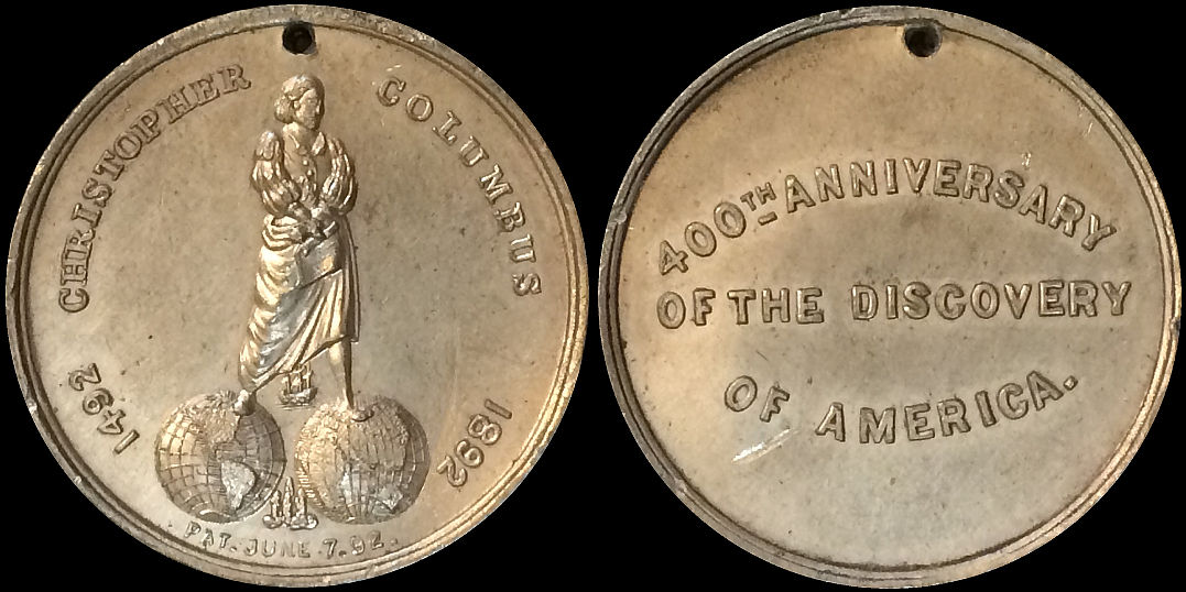 181) Columbus standing on two globes. 1492 Christopher Columbus 1892 around to the left and right. Pat. June 7. 92." below globes. Rv: 400th Anniversary Of The Discovery Of America. in three lines with the first and third lines curved. /// SH6-41. Very rare, White metal / 35 mm (IMAGE courtesy Bill Walter)