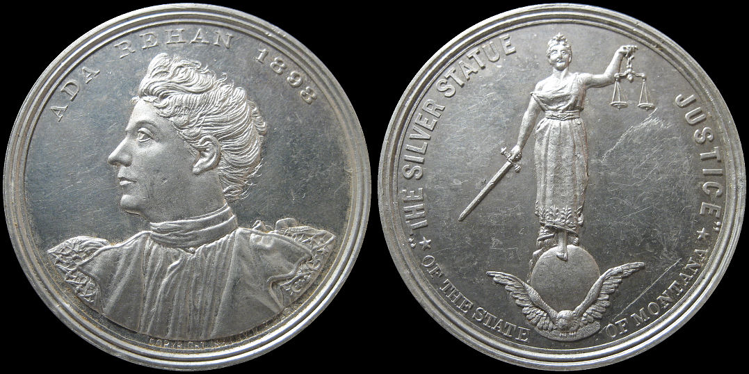 187) Female bust with head turned left. Ada Rehan 1893 around above bust. Rv: Female figure standing on small globe with sword in her right hand and scales in her left hand. Globe rests on eagle below. The Silver Statue around to the left. Justice around to the right. Of The State of Montana around below to the left and right of eagle. /// Very scarce to rare in aluminum or white metal. Sometime described as silver plated. / 44.6 mm / SH6-69, HK767, Rulau But 30 (IMAGE)