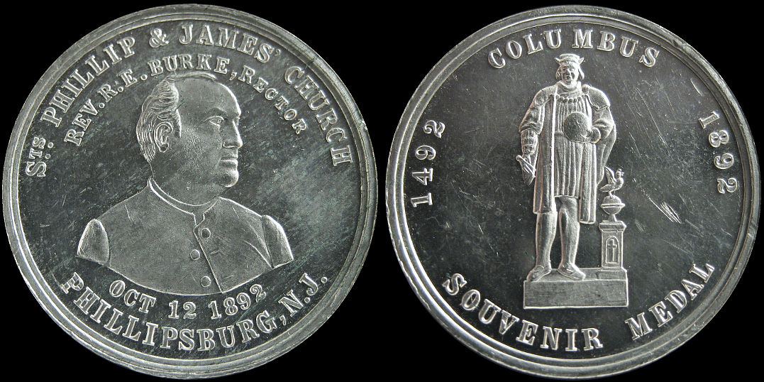 189) Man standing on pedestal with globe in his left hand. Columbus around above. Souvenir Medal around below. 1492 around to the left. 1892 around to the right. Rv: Bust 3/4 right. Sts Phillip & James Church Rev. R.E. Burke, Rector around above in two arcs. Oct 12 1892 Phillipsburg, N.J. below in two arcs. /// Scarce in Bronze. Very scarce in White Metal. Rare in Aluminum / 38.3 mm (measured) / HK627, HK628, Eglit309, Eglit309A (IMAGE)