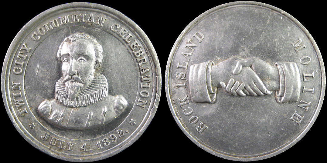 194) Bearded bust slightly left within inner circle wearing ruff collar. Twin City Columbian Celebration around above. July 4. 1892. around below. Microscopic OA at base of bust. Rv: Two clasped hands. Rock Island Moline to the left and right. /// Very rare, Aluminum / 36.7 mm (measured) / Eglit310. Related to the World Columbian Expo in Chicago (IMAGE)