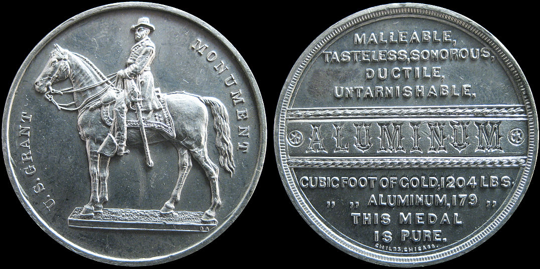 195) Man on horseback left. U.S. Grant Monument to the lower left and upper right. Rv: Incused ALUMINUM across the middle between two lines. Malleable Tasteless Sonorous Ductile Untarnishable. above in four lines. Cubic Foot Of Gold, 1204 lbs Aluminum 179 This Medal Is Pure below in four lines. Childs, Chicago. around below next to rim in tiny lettering./// Rare, Aluminum / 37.0 mm (measured) / HK759a in the second edition of HK. Same reverse as HK161 (IMAGE)
