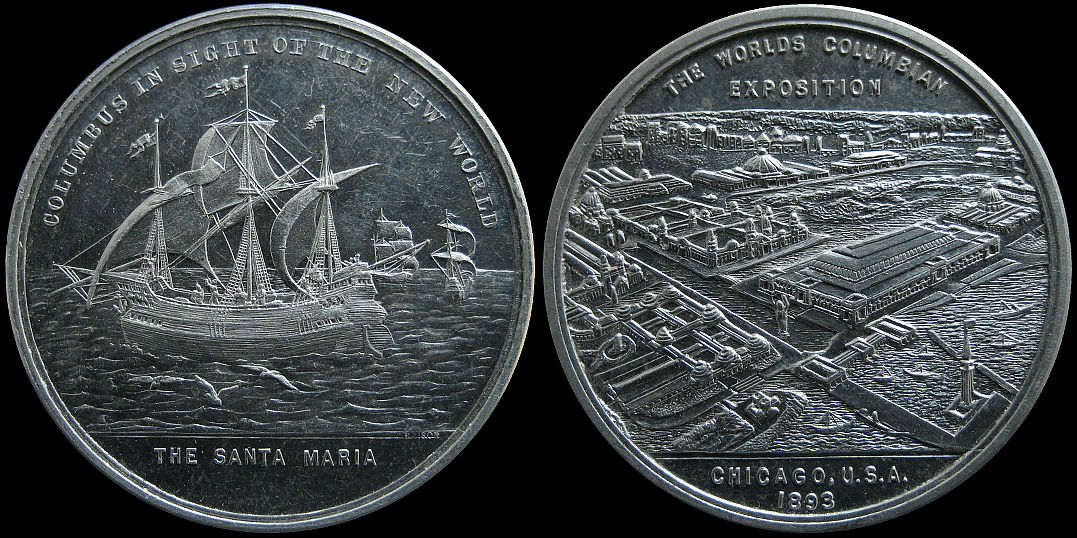 20) Ariel view of the fair. The Worlds Columbian Exposition above in one curved line and one straight line. Chicago, U.S.A. 1893 below in two lines. Rv: Sailing ship with two smaller ships to the right. Columbus In Sight Of The New World around above. The Santa Maria below. Hanson in microscopic lettering at bottom left base of sea scene. /// Rare, Aluminum / 37.9 mm / SH6-151, HK167, Eglit535(smaller version) (IMAGE)