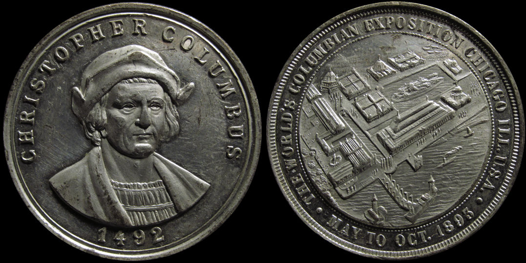 4) Scene depicting landing of Columbus. Landing of Columbus below around curve. C. Reinsch at base of landing scene in tiny lettering. Rv: Discovery Of America 1492 Columbian Fair Chicago. Illinois. U.S.A., 1893. /// Common, maybe scarce, Aluminum / 39.7 mm / SH6-33, HK158, Eglit17 (IMAGE)