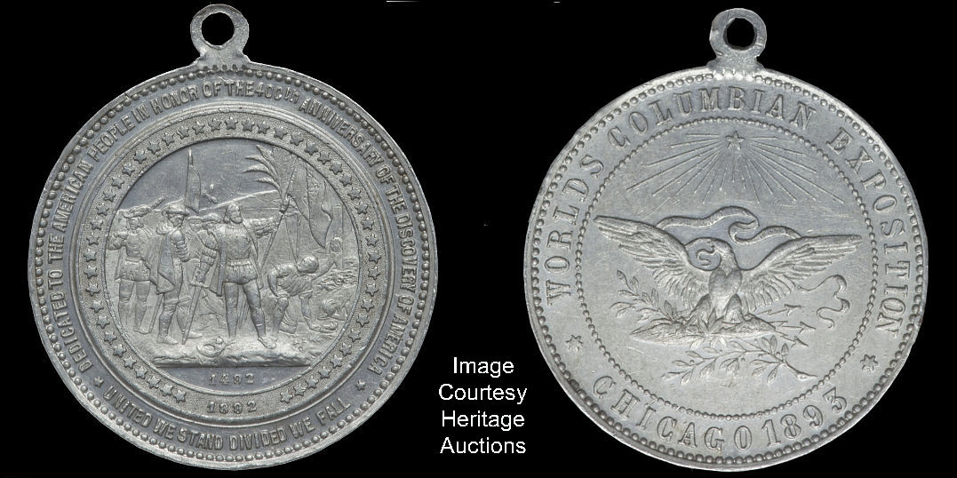 202) Landing scene surrounded by enclosed inner circle of stars. 1492 in exergue within inner circle. 1892 below within inner enclosed circle of stars. Dedicated To The America People In Honor Of The 400th Anniversary Of The Discovery Of America around outside of stars. United We Stand Divided We Fall around outside circle of stars below. Rv: Spread eagle with radiant star above, all within beaded inner circle. Worlds Columbian Exposition around above Chicago 1893 around below /// Found described as copper, aluminum, gilt, and silvered. Rare overall. Usually found looped as struck. Unlooped pieces may have had loop removed. The landing scene depicted is very similar to HK220 / 36 mm / SH6-37, Eglit313. (IMAGE)