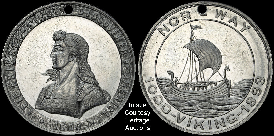 203) Bust left within inner circle. Leif Eriksen Discoverer of America around outside. 1000 below. Rv: Viking ship sailing right within inner circle. Norway above. 1000-Viking-1893 around below /// Aluminum / 37.2 mm / Rare to very rare. There is a small guide circle at 12:00 on these medals to help place a hole, but at least half that I have found are unholed / SH6-113, Eglit47 (IMAGE)