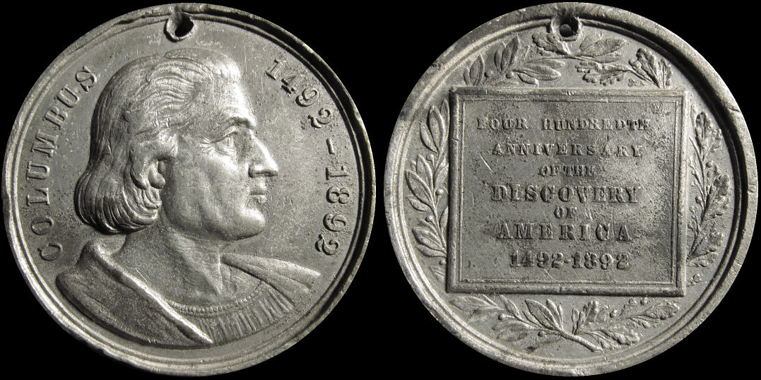207) Bust right. Columbus 1492-1892 to the left and right. Rv: Rectangular plaque over wreath. Four Hundredth Anniversary Of The Discovery Of America 1492-1892 in seven lines within plaque /// Rare and possibly always holed, White metal / 37.8mm / Same obverse as HK224. SH6-156 (IMAGE)