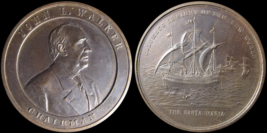 21) Male bust right within inner circle. John L. Walker around above. Chairman below. Rv: Sailing ship with two smaller ships to the right. Columbus In Sight Of The New World around above. The Santa Maria below in exergue. /// Very rare, Brass / 37.9 mm / The reverse of HK167 with a different obverse. Looking through the official report from the 1893 Worlds Columbian Expo, I could find no mention of a John L. Walker, so it looks as if he was probably not associated with the fair. The reverse die is a Hanson of Chicago die that was sometimes repurposed ten to fifteen years after the fair ended. (IMAGE)