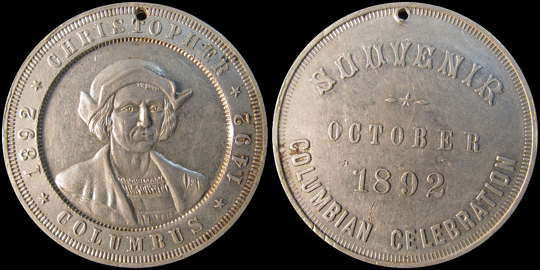 211) Bust slightly right with hat within inner circle. Christopher Columbus around outside above and below. 1892 outside to the left. 1492 outside to the right. Rv: Souvenir October 1892 Columbian Celebration in four curved and straight lines. /// SH6-139. Very rare, Aluminum / 35 mm / Reverse is not in HK. The obverse combines what is inside the inner circle of the obverse of HK227(Columbus portrait) with exactly what is outside of the inner circle of the obverse of HK160. (IMAGE). This piece is also shown on this website HERE with a hanger